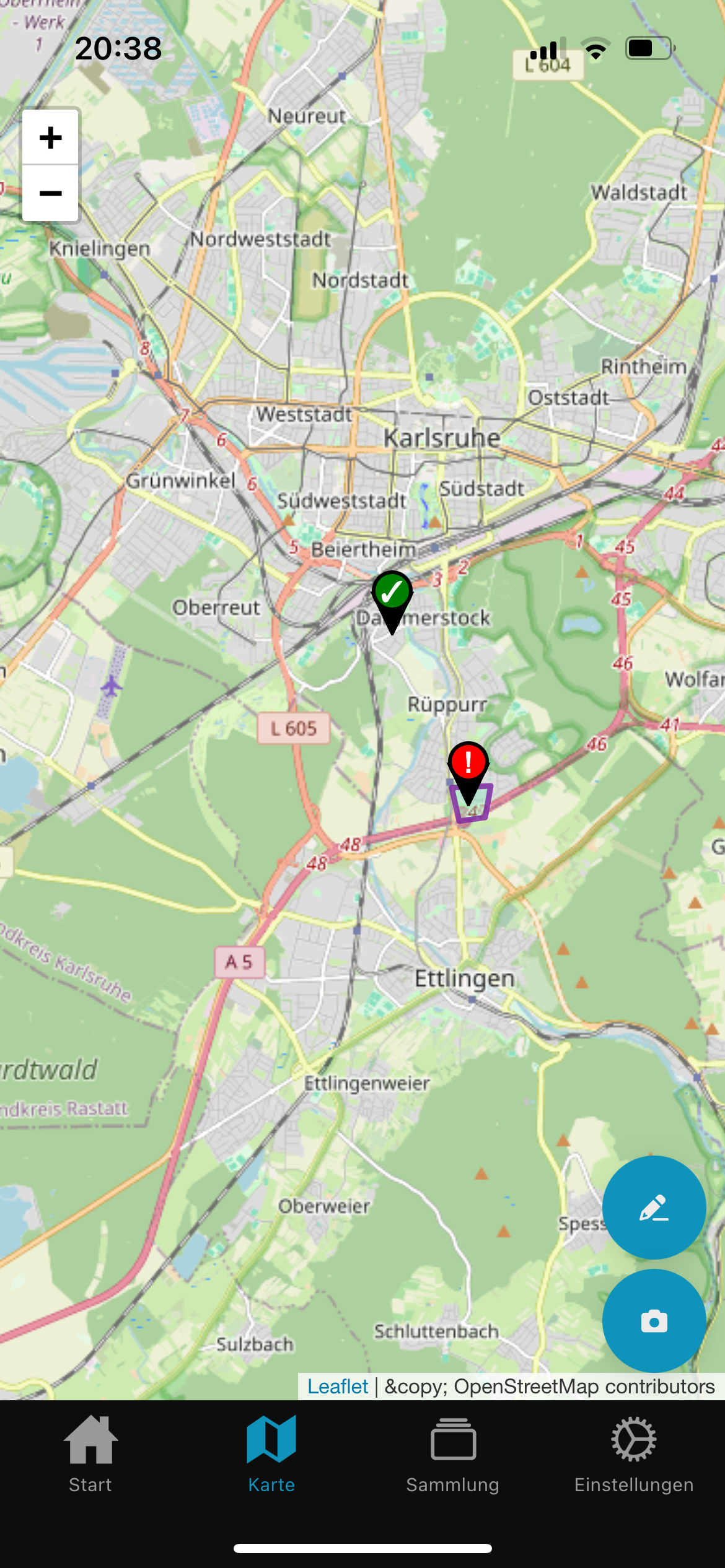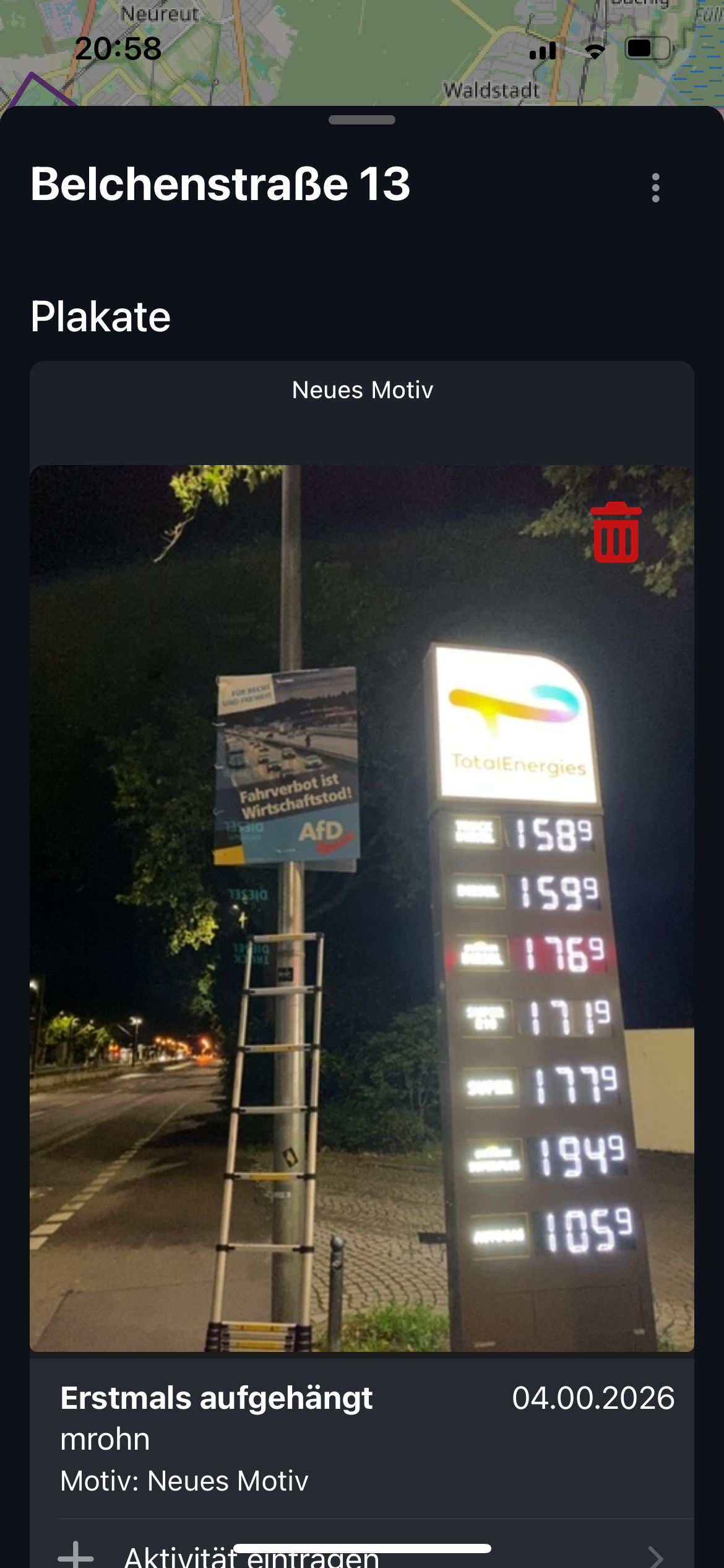 Durch Tippen auf das Kamerasymbol kann ein Foto von einem Plakat aufgenommen und ein neuer Plakatstandort angelegt werden. Mehr dazu in TODO