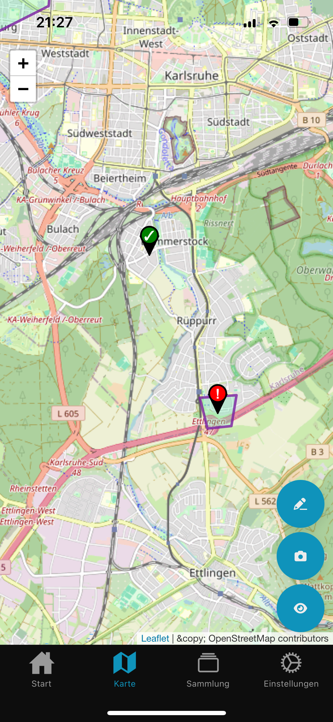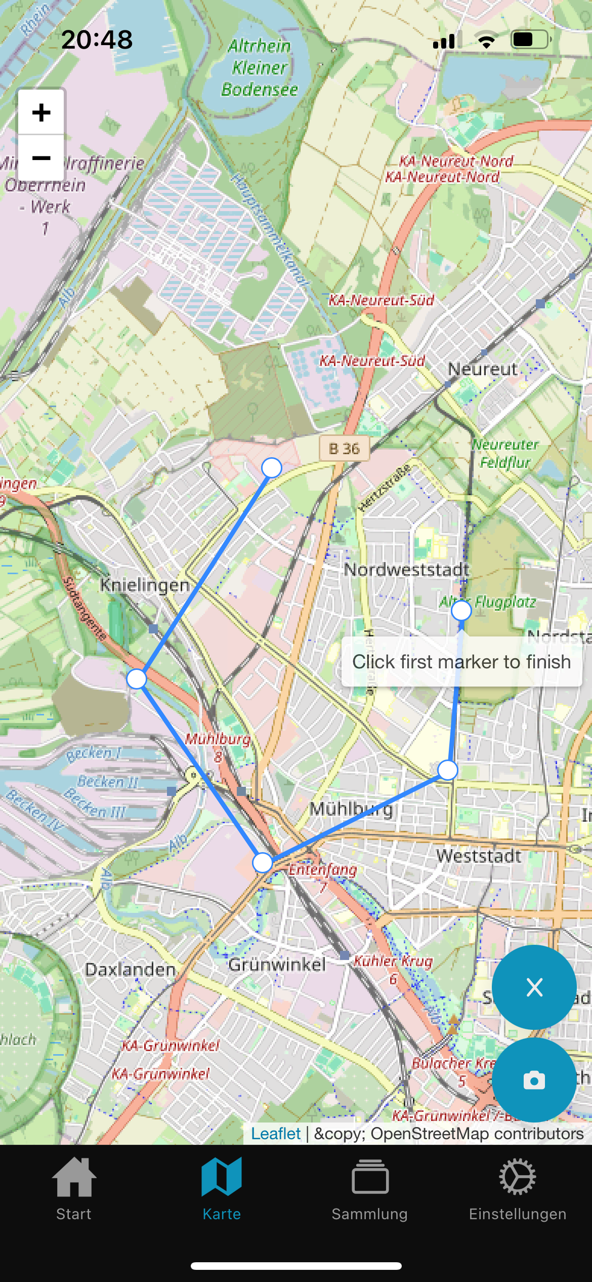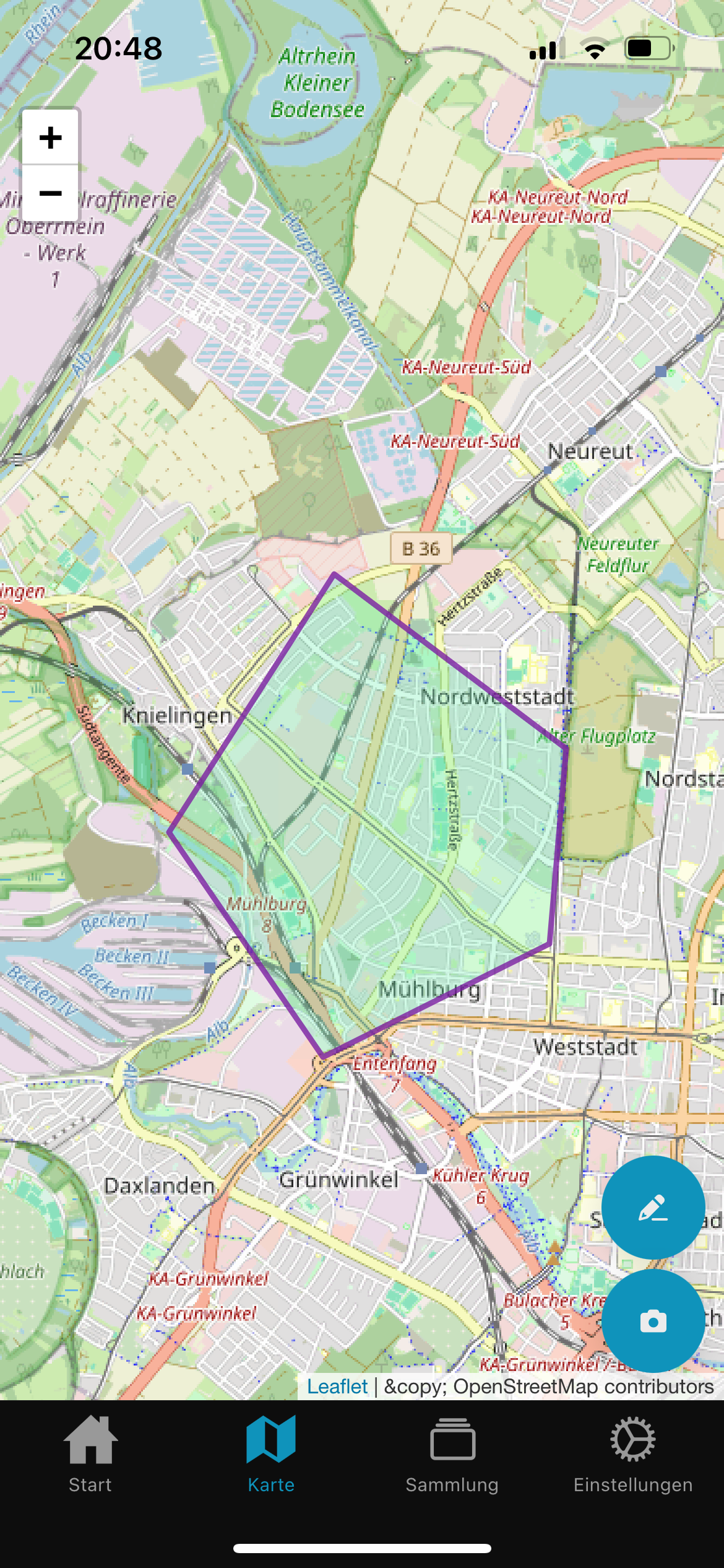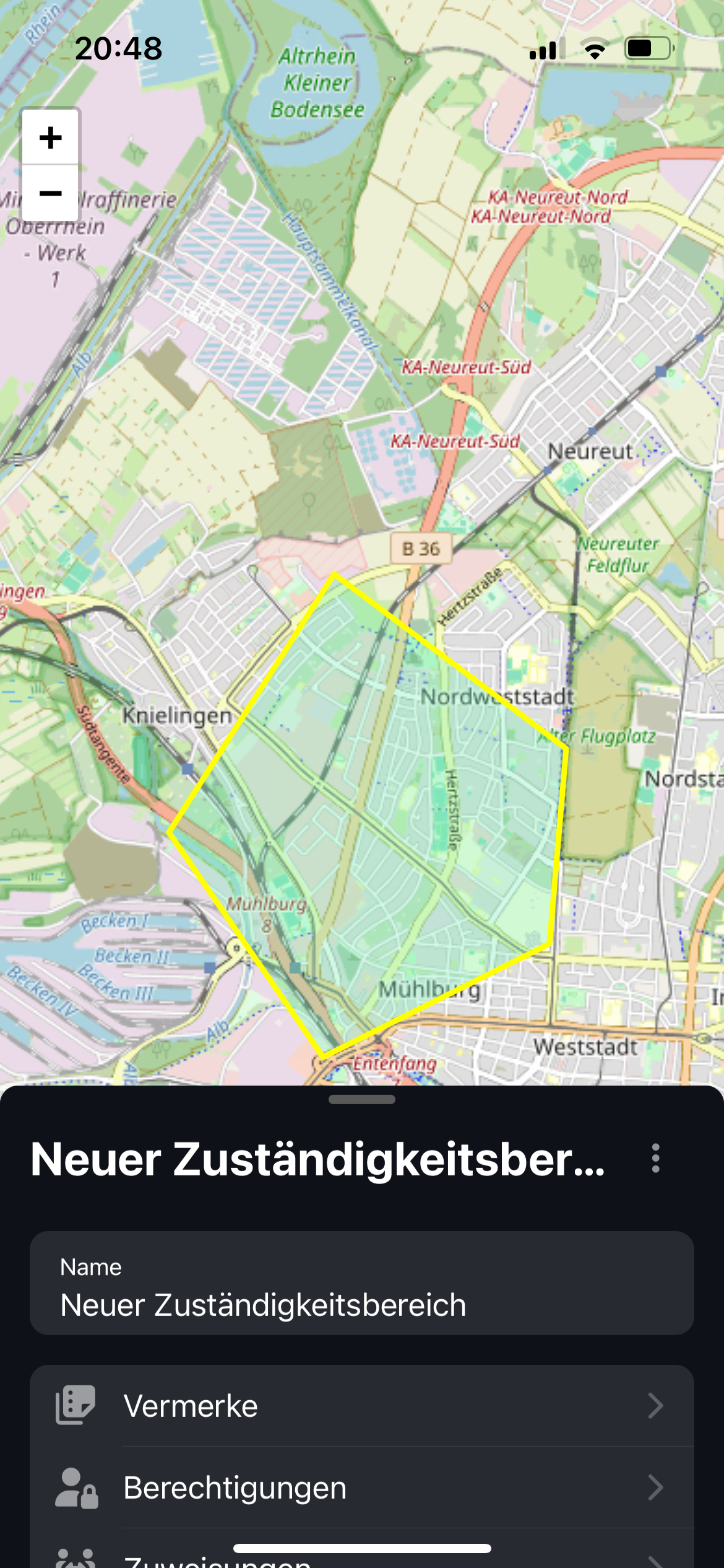 Durch Tippen auf das Stift-Symbol können neue Zuständigkeitsbereiche eingezeichnet werden. Durch Tippen auf die Karte werden neue Ecken zum Bereich hinzugefügt. Durch schließen des Kreises (indem auf den ersten Punkt geklickt wird), wird der Vorgang abgeschlossen, alternativ lässt sich über den X-Knopf der Vorgang abbrechen.