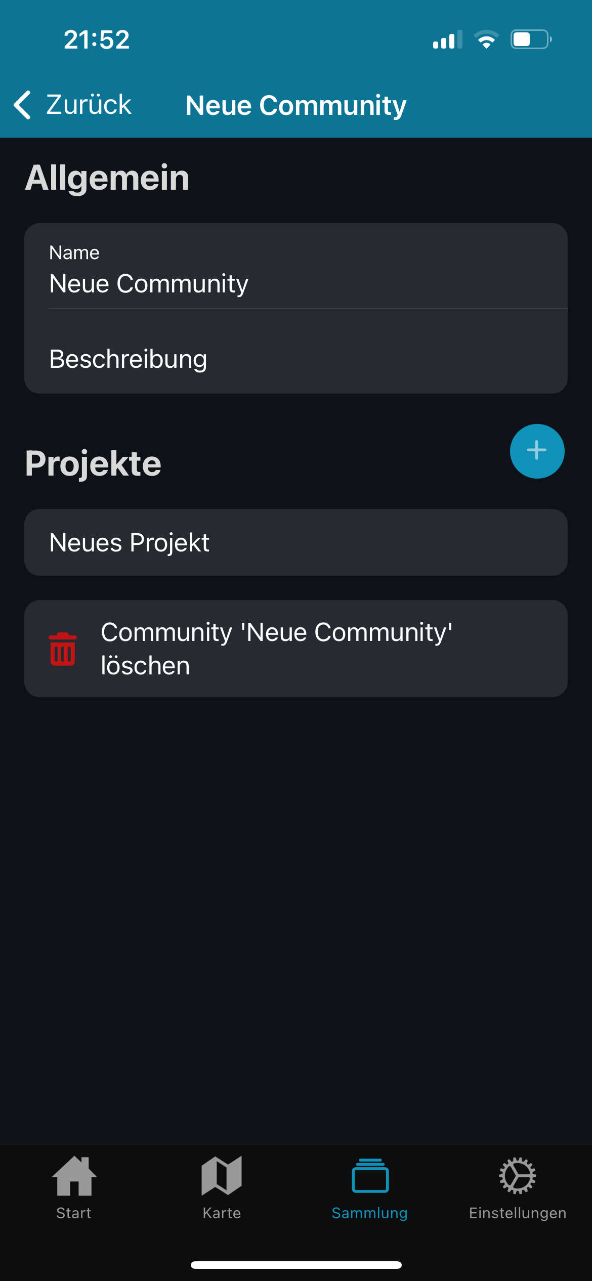 Tippen Sie auf “Neue Community erstellen”. Sogleich taucht in der Liste ein neuer Eintrag “Neue Community auf”.