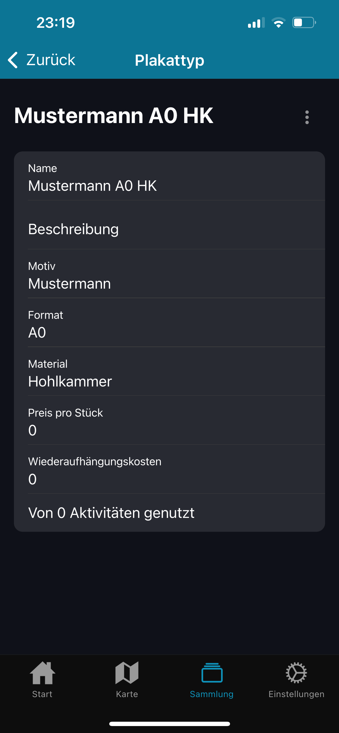 Diese Informationen müssen für jedes aufgehängte Plakat hinterlegt werden. (Theoretisch ist es auch möglich, einen einen Catch-All Plakattypen für alle Plakate zu verwenden, dann ist im Nachhinein jedoch keine sinnvolle Auswertung nach Motiven und Formaten mehr möglich)