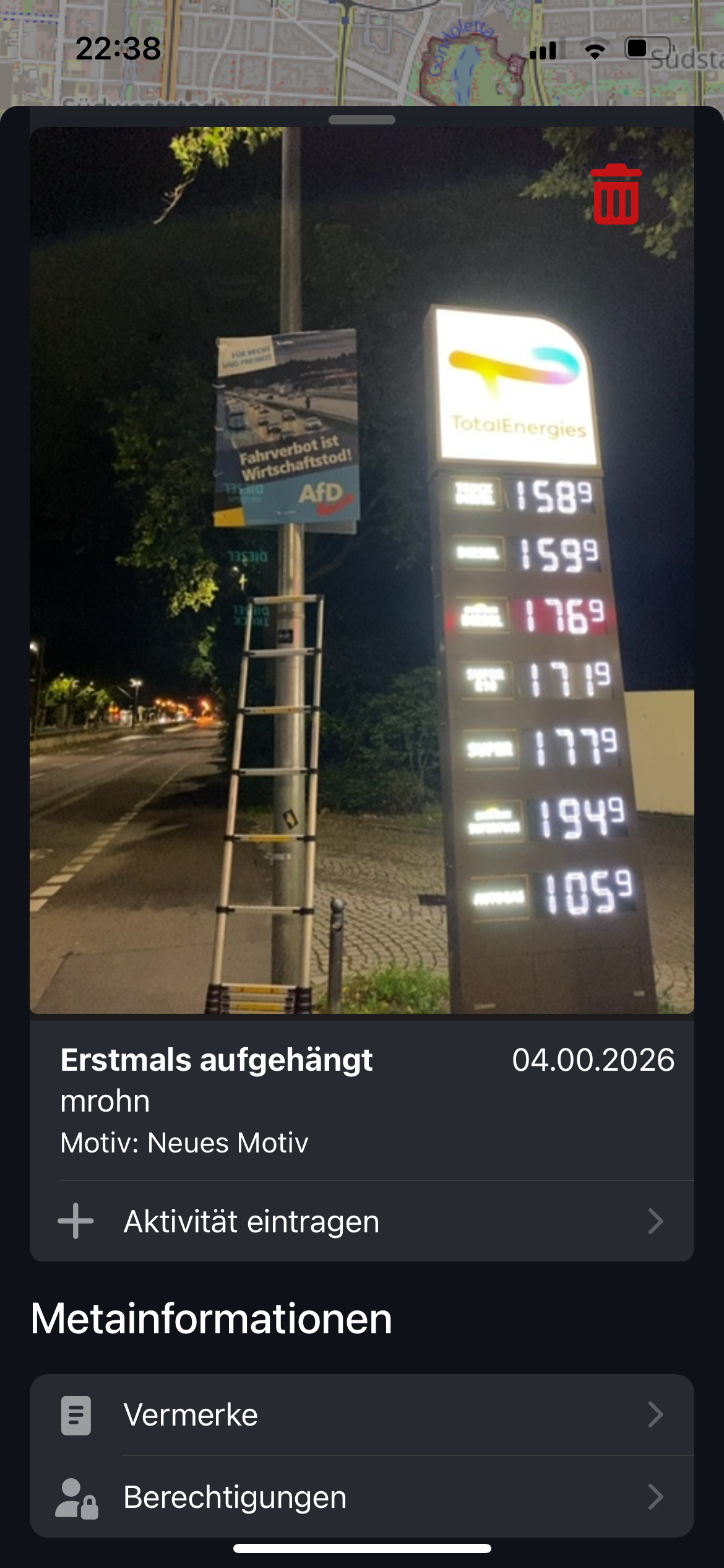 Wenn Sie an einem Standort vorbeikommen, an welchem ein Plakat gestohlen oder beschädigt wurde, können Sie dies in allen Fällen korrekt dokumentieren.