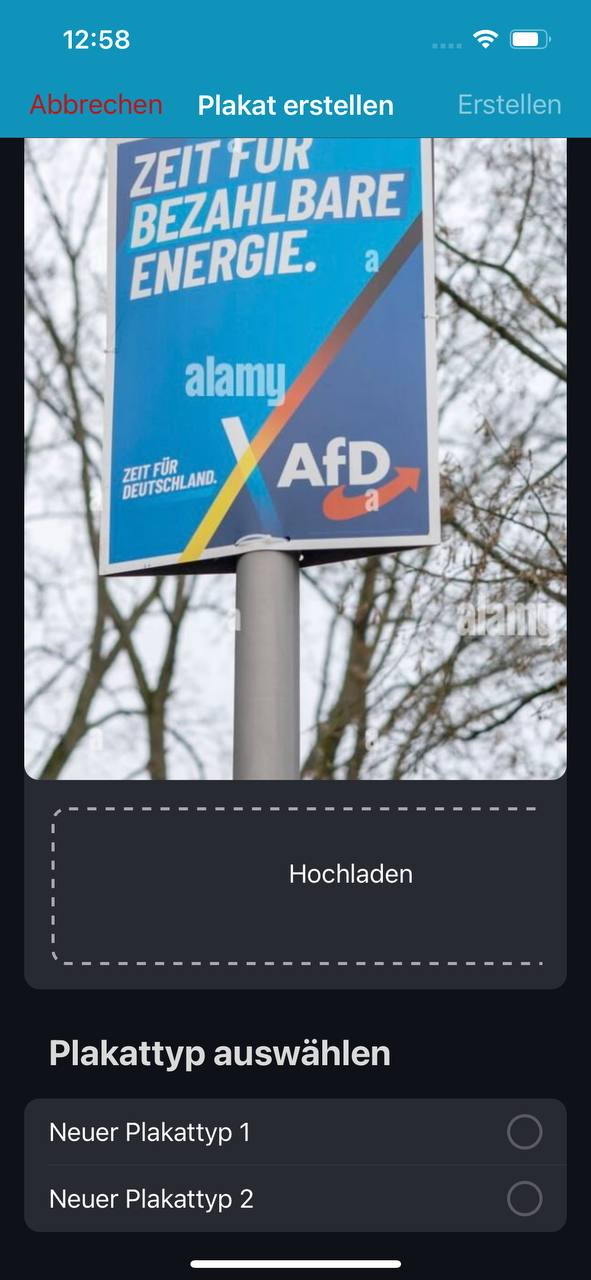 Nach Bestätigung öffnet sich ein Dialog, in dem das aufgenommene Bild sowie die aktuelle Adresse angezeigt werden. Ebenfalls muss hier der verwendete Plakattyp ausgewählt werden.